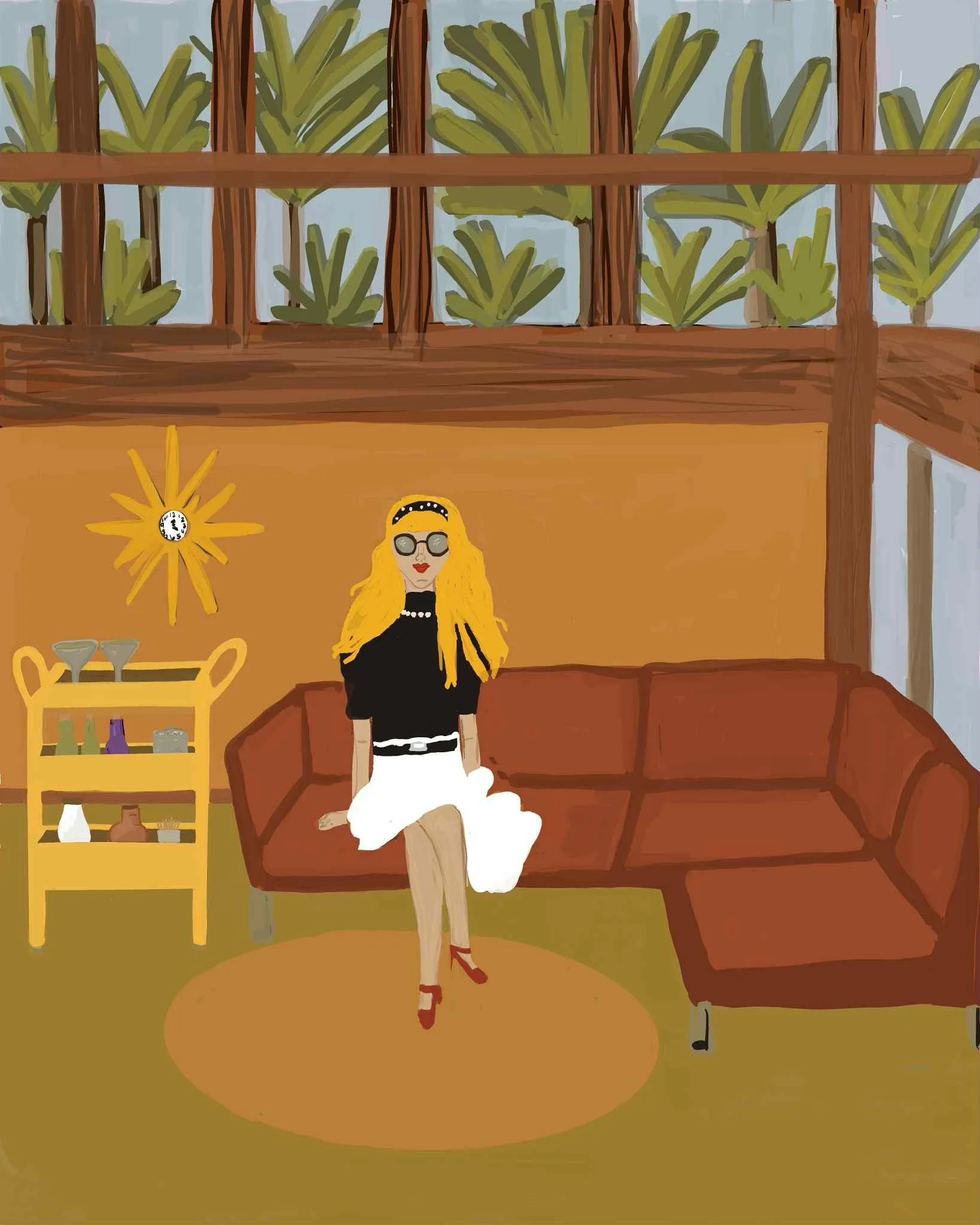 A woman with long yellow hair, wearing sunglasses, a black top, white skirt, and red shoes, sitting on a brown sectional sofa in a mid-century modern living room with a yellow wall, a sunburst clock, a yellow bar cart with bottles and glasses, and a large window with green plants outside.