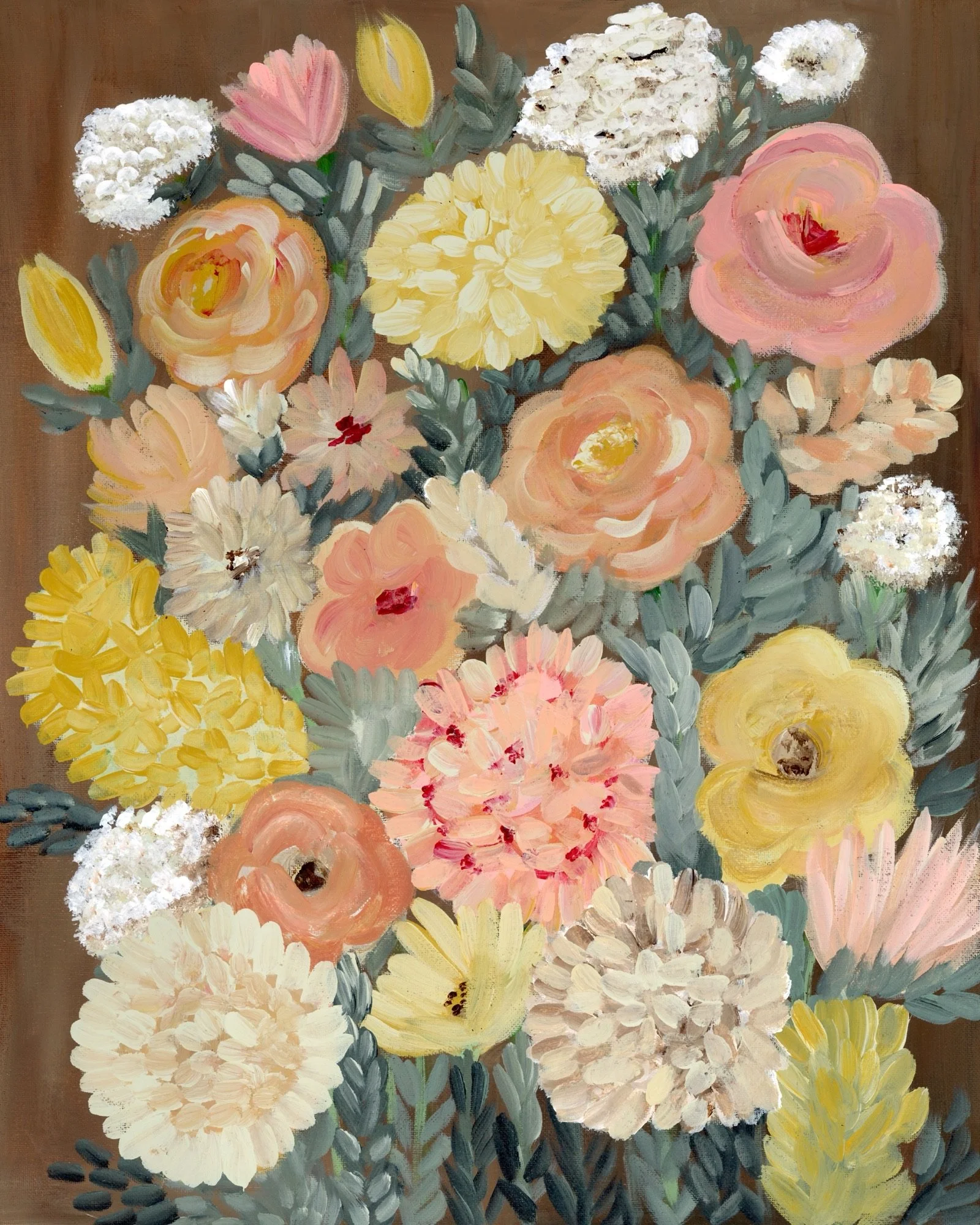 A painting of a bouquet of various flowers in pastel colors, including yellow, pink, white, and peach, with green leaves on a brown background.