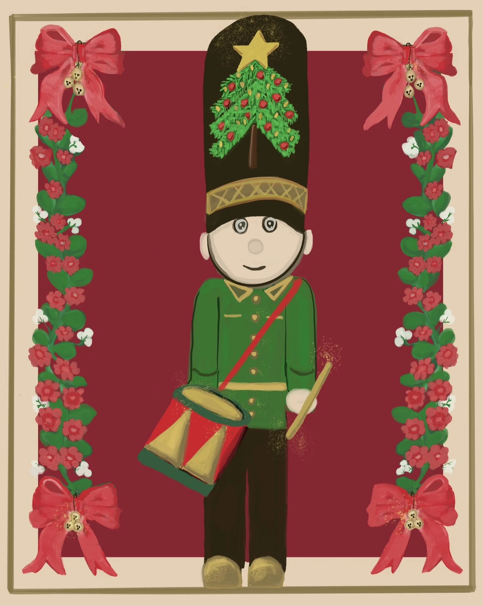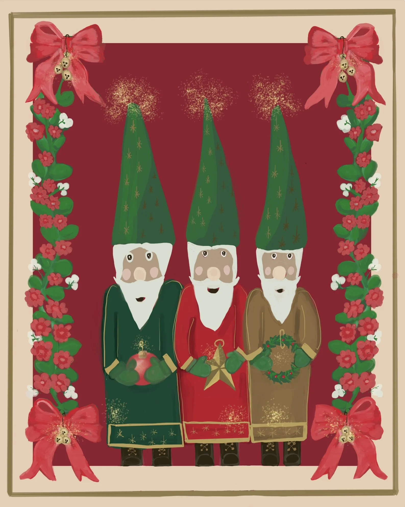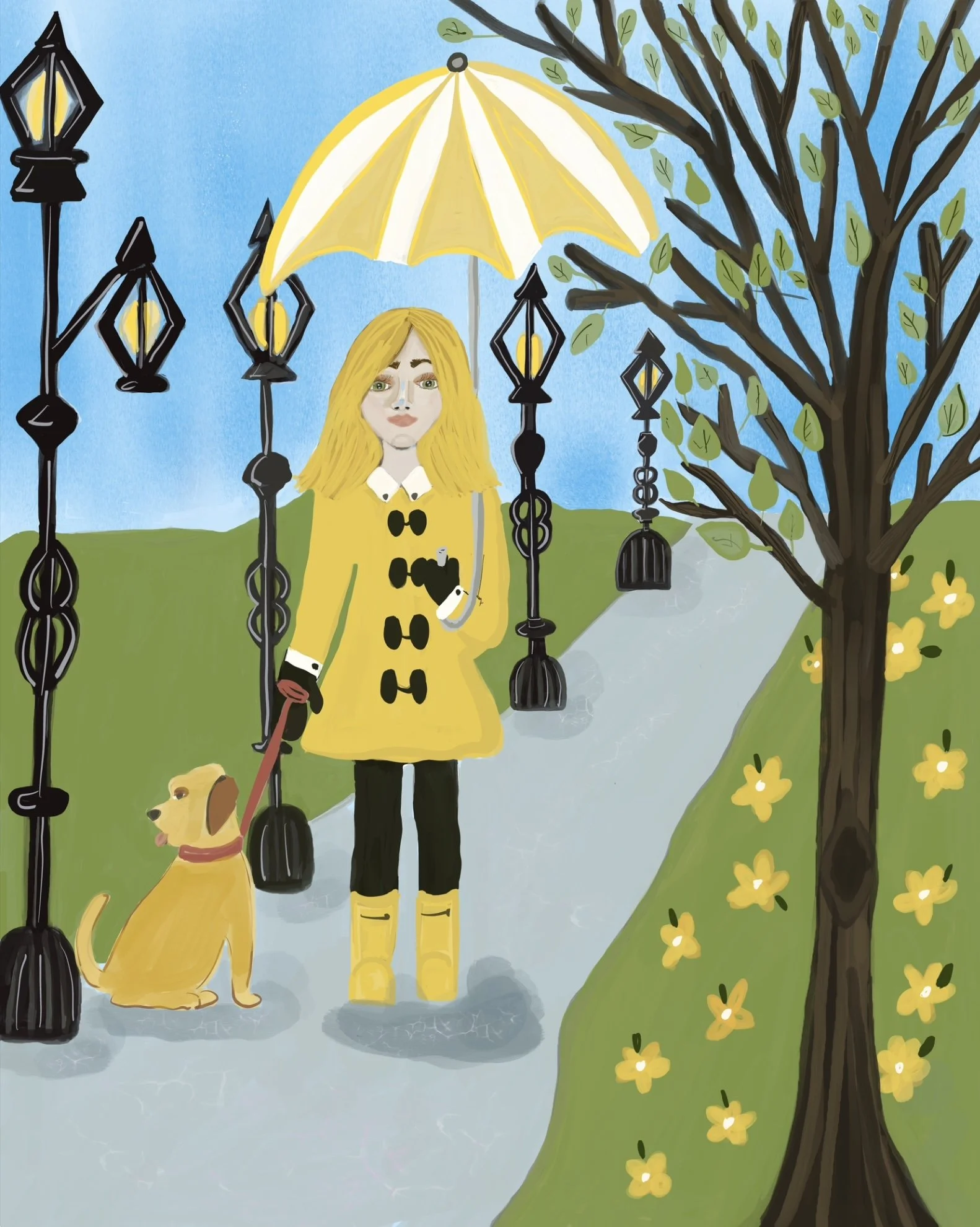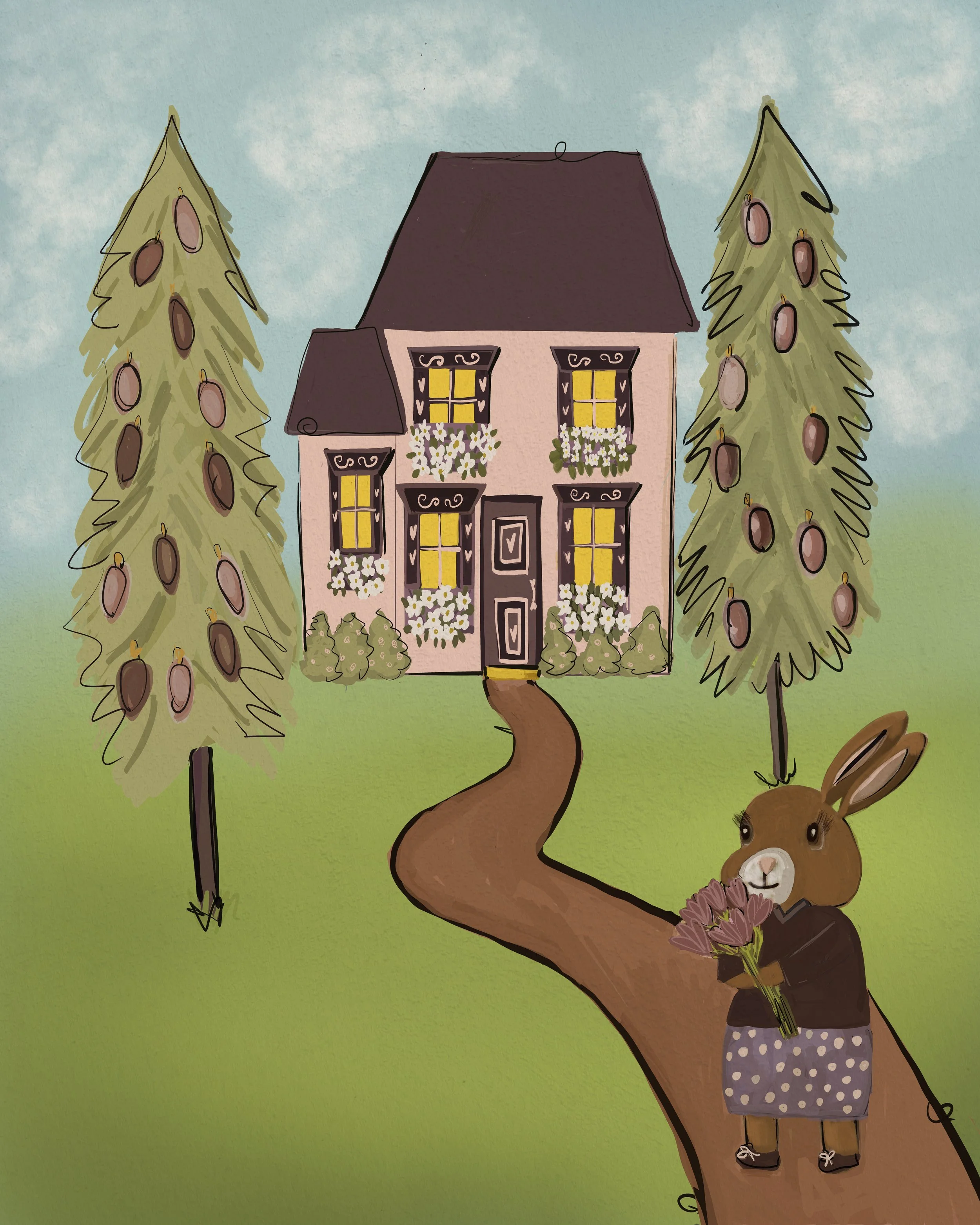 A digital painting of various flowers, mushrooms, a butterfly, a hummingbird, a crow, and a black cat against a dark background.