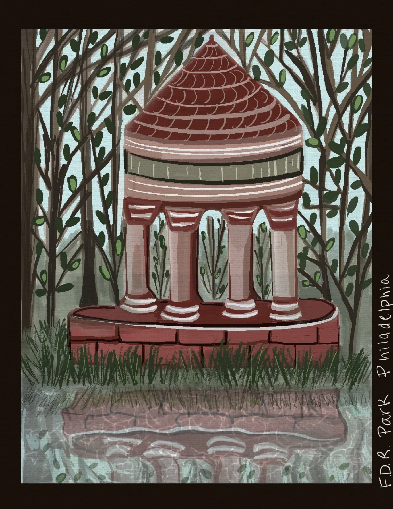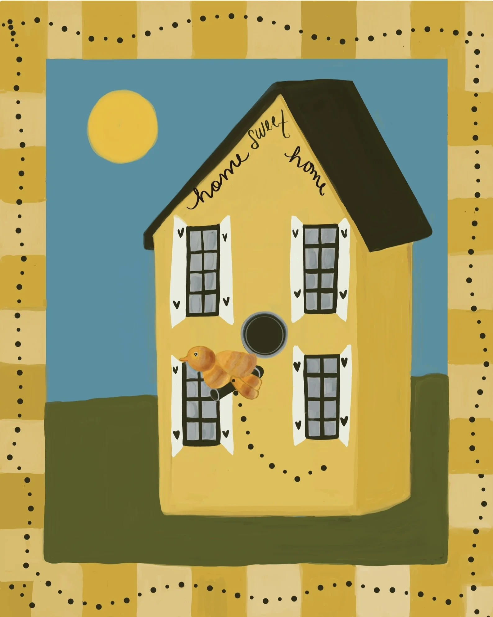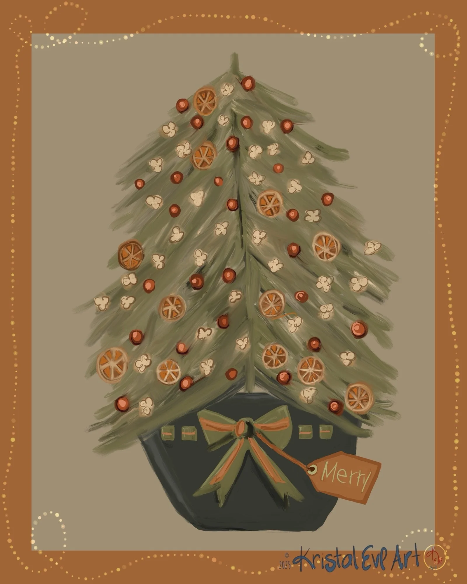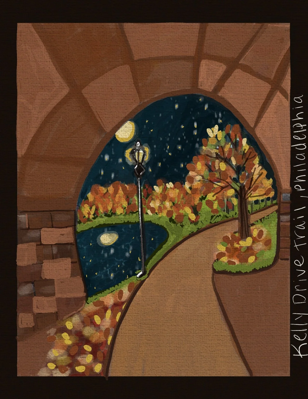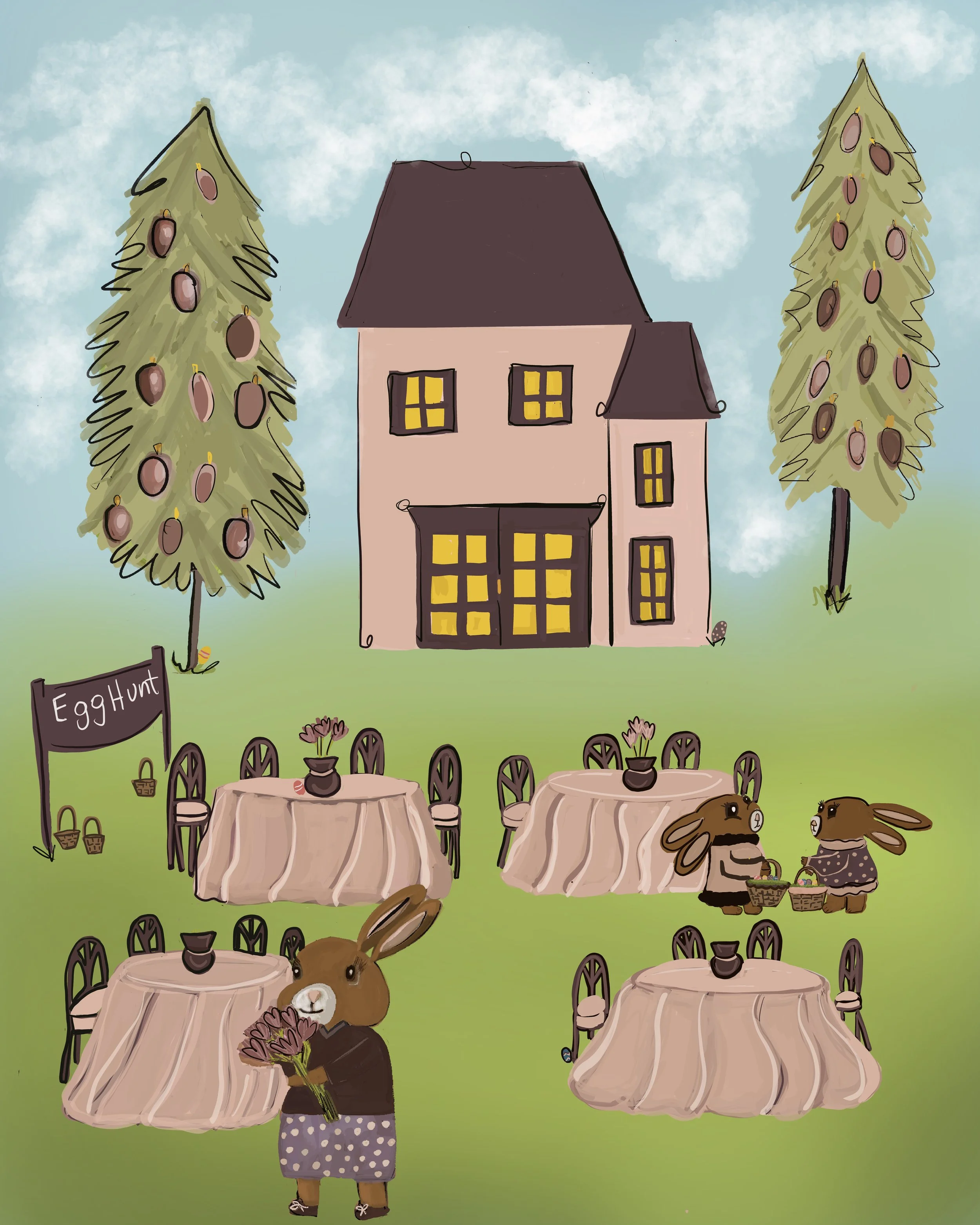 A digital painting of various flowers, mushrooms, a butterfly, a hummingbird, a crow, and a black cat against a dark background.