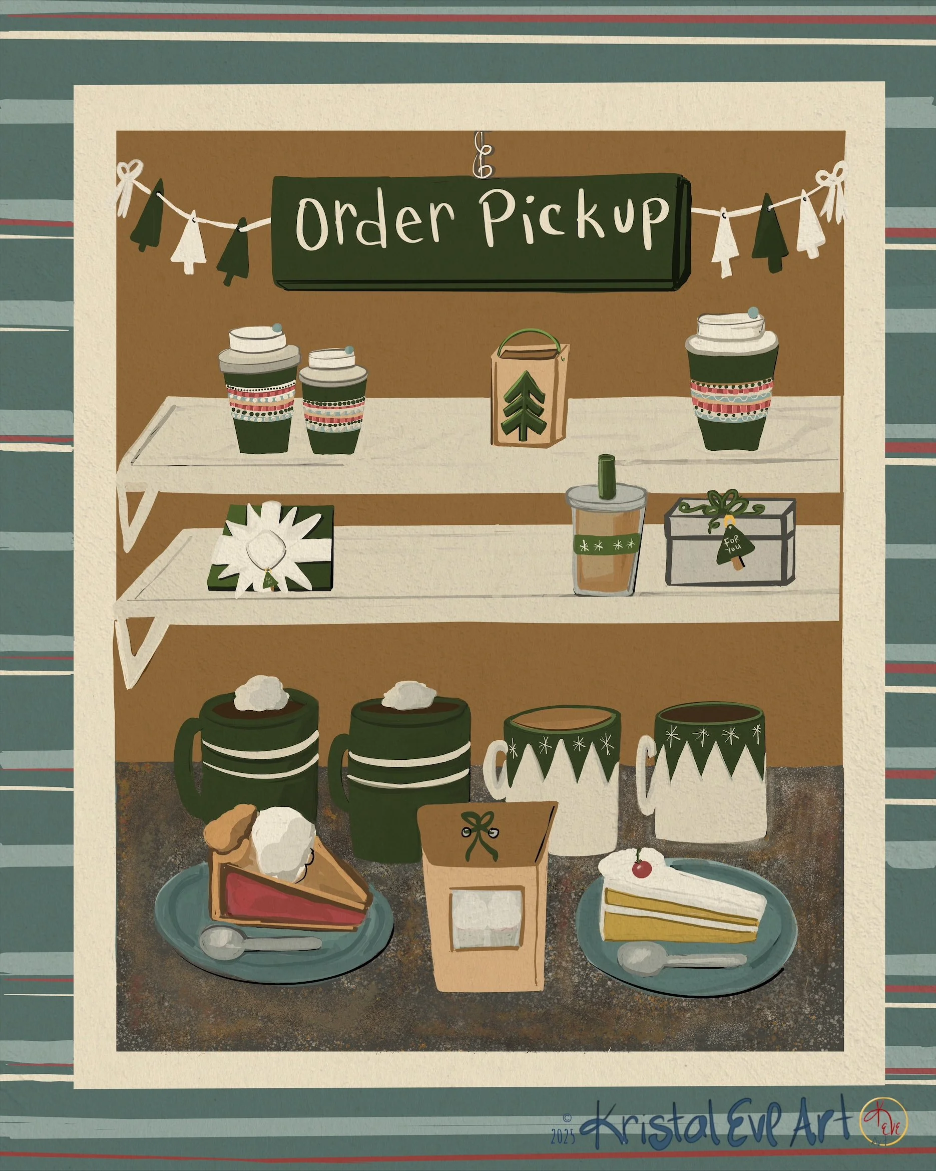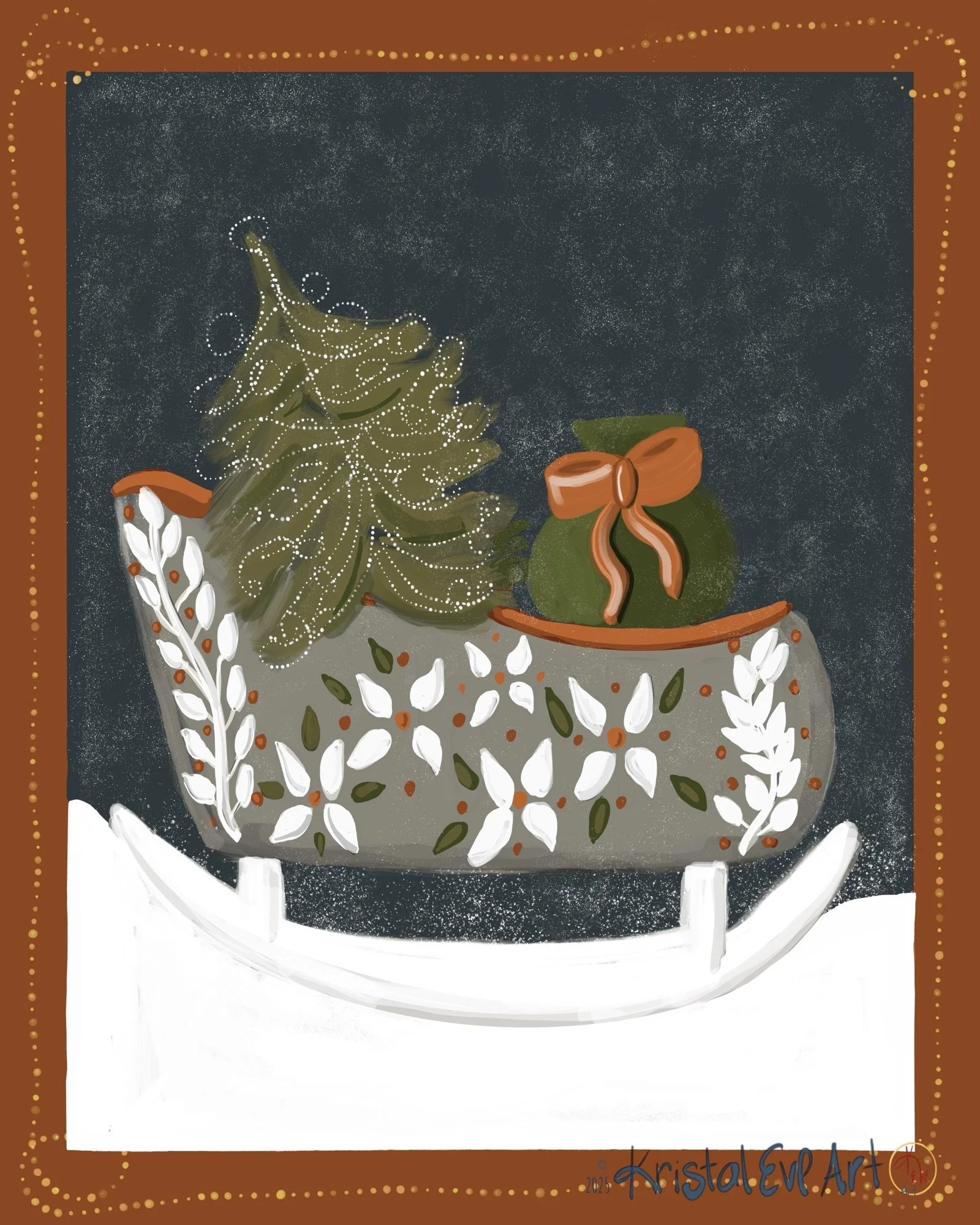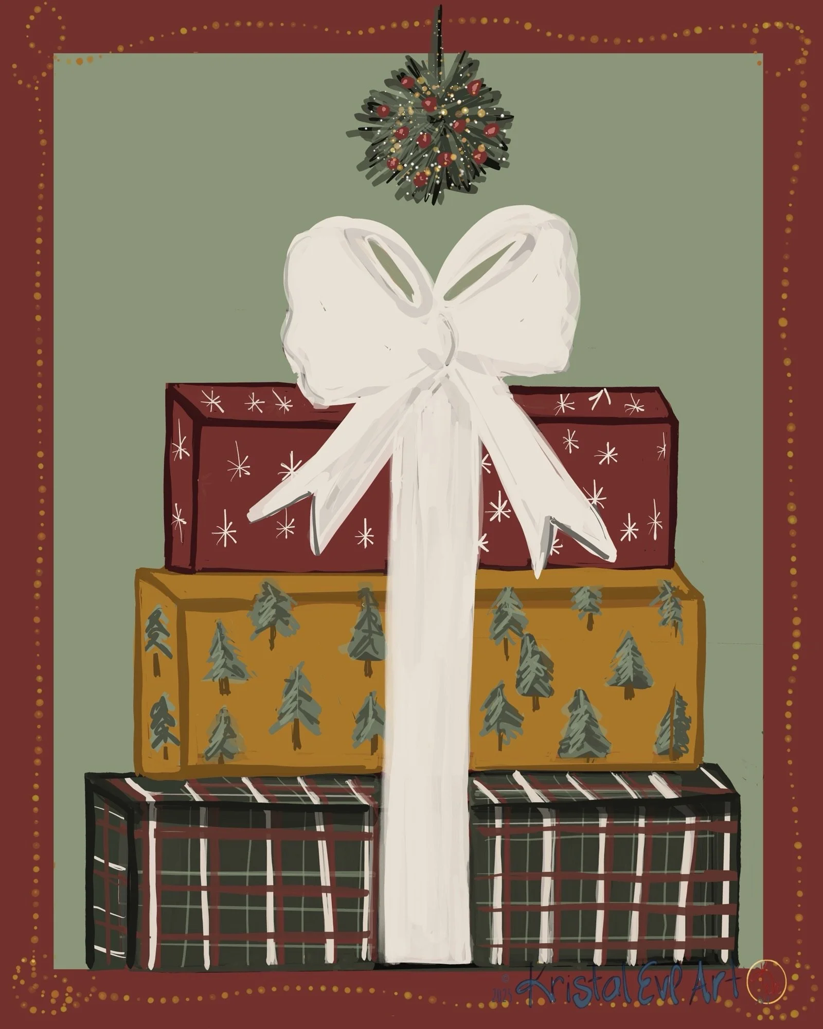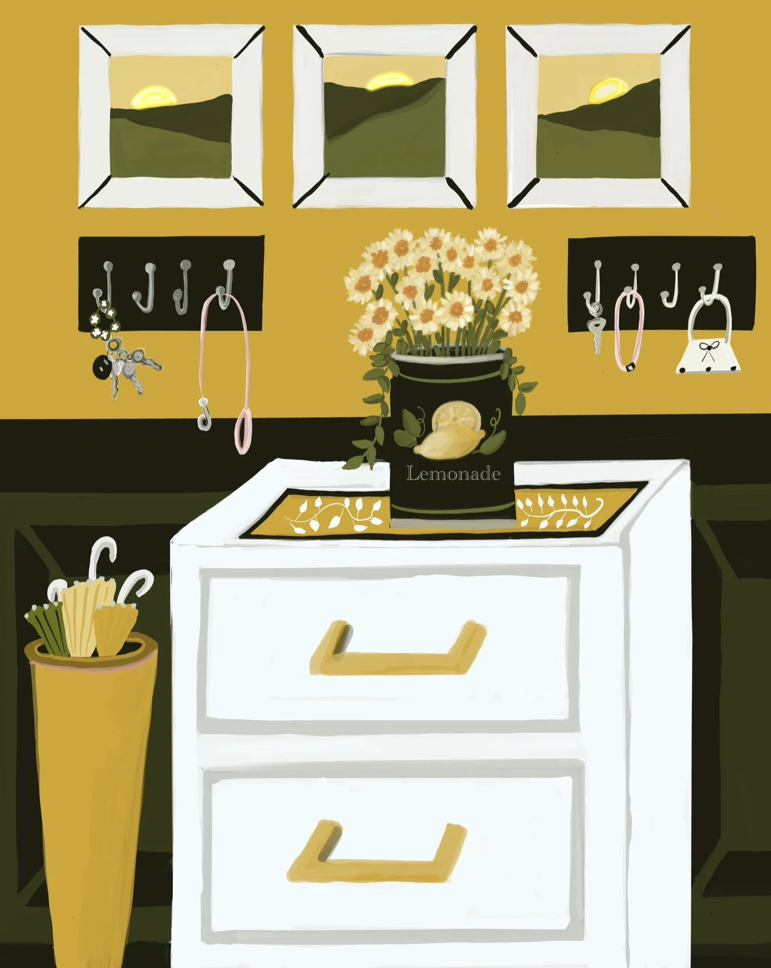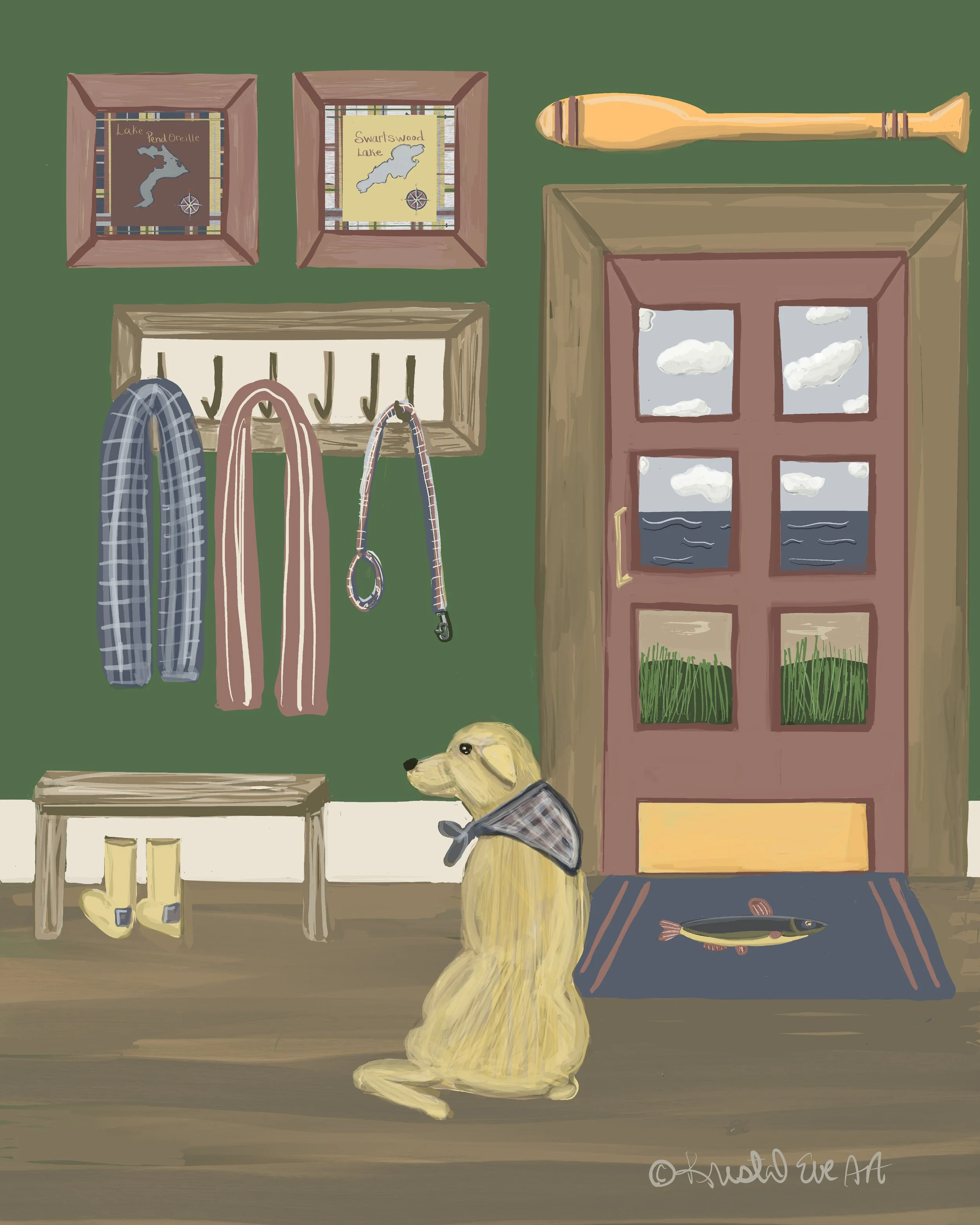 Painting of two white wedding dresses hanging on decorative hooks from a wooden shelf with green ivy.