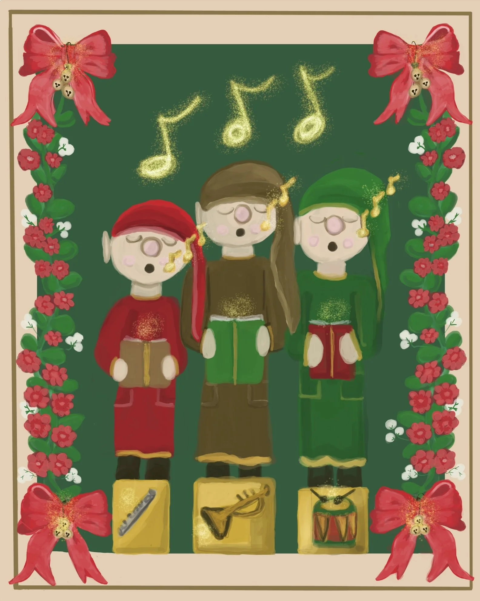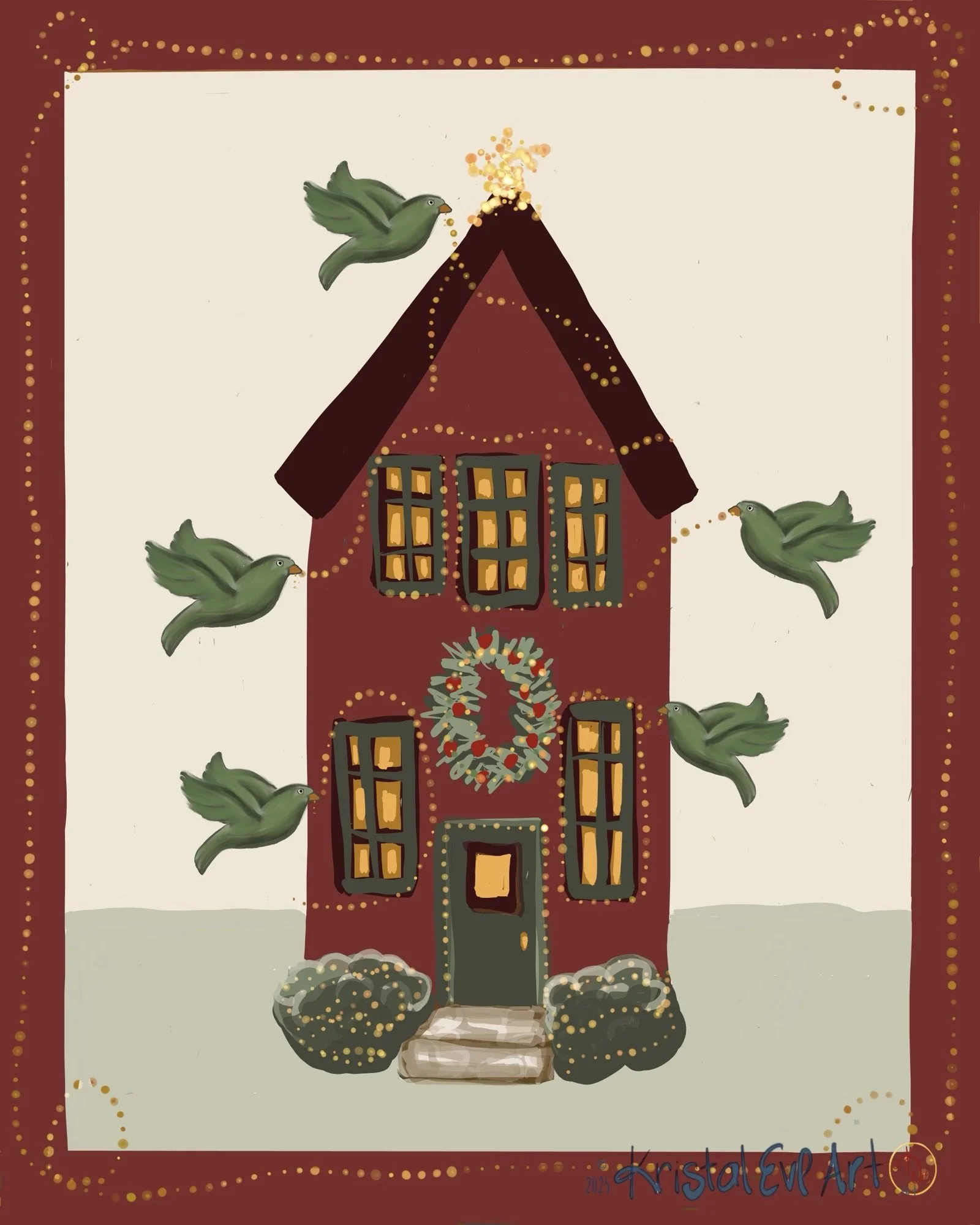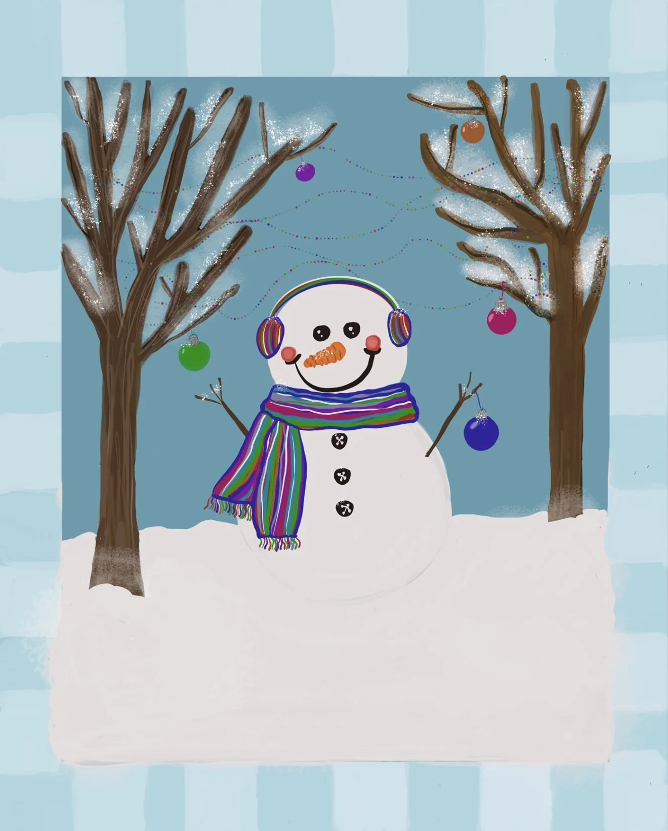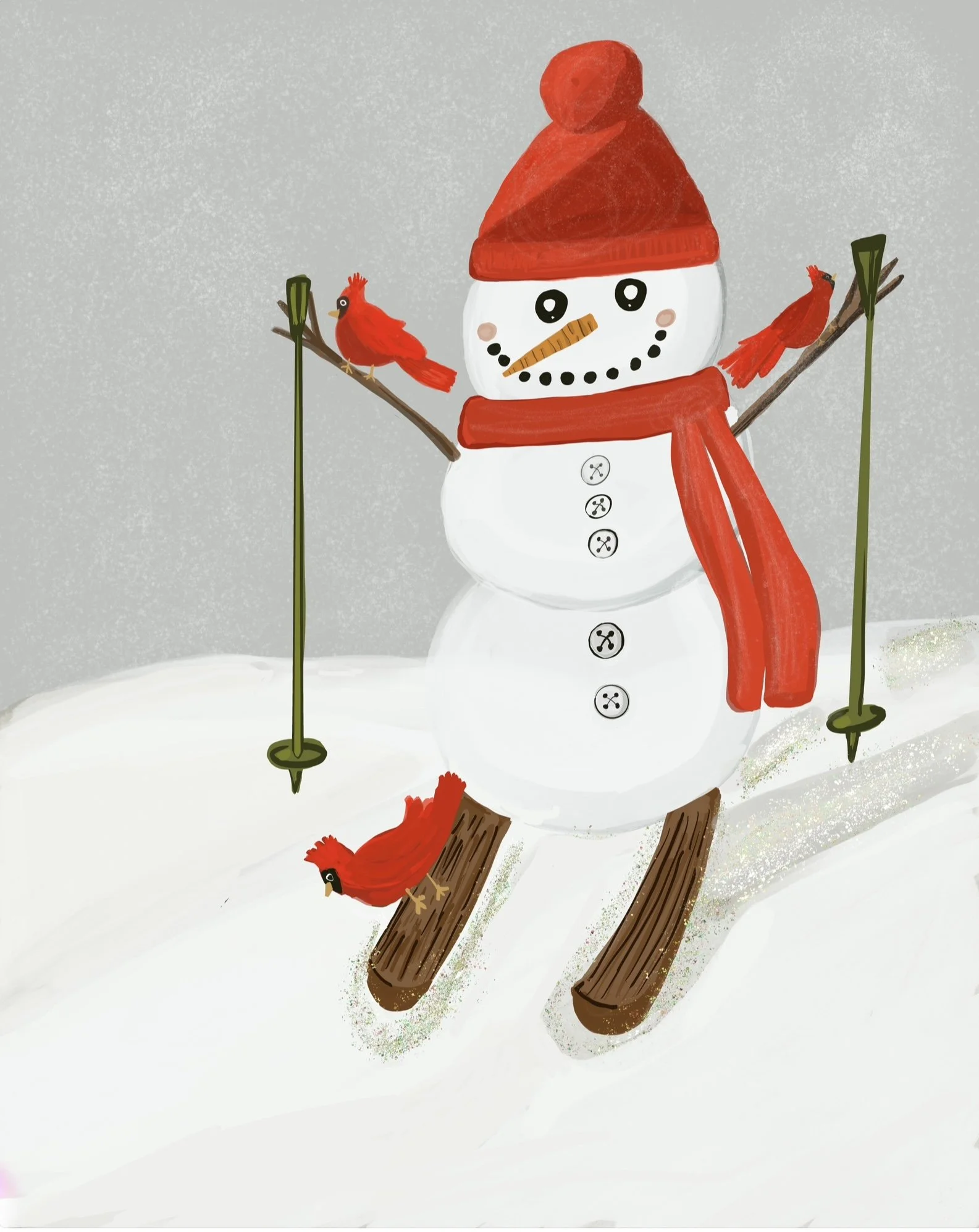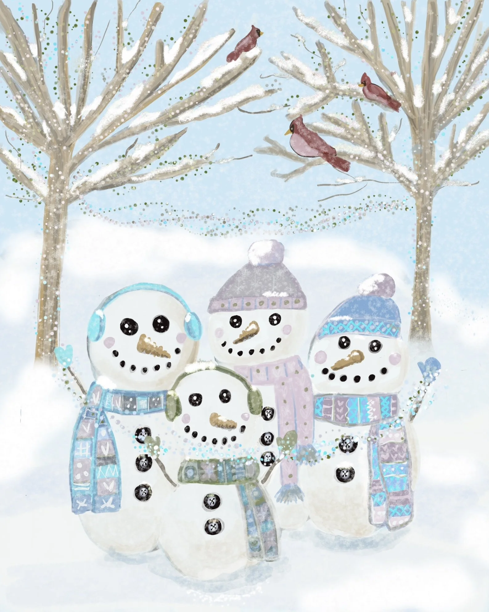 Illustration of a snowman with a red hat and scarf, surrounded by three red cardinals, standing in the snow.