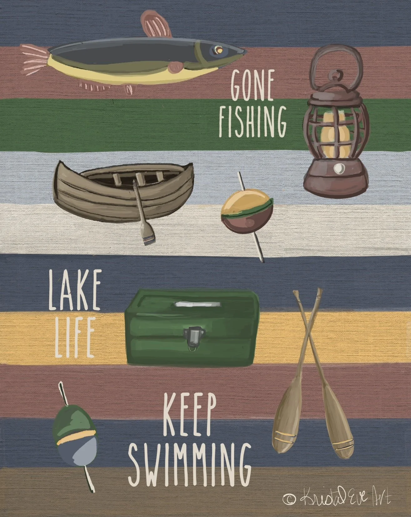 Illustration of a vintage tackle box with fishing lures, flies, and tackle items inside, labeled 'United Tackle Co., 1975'.