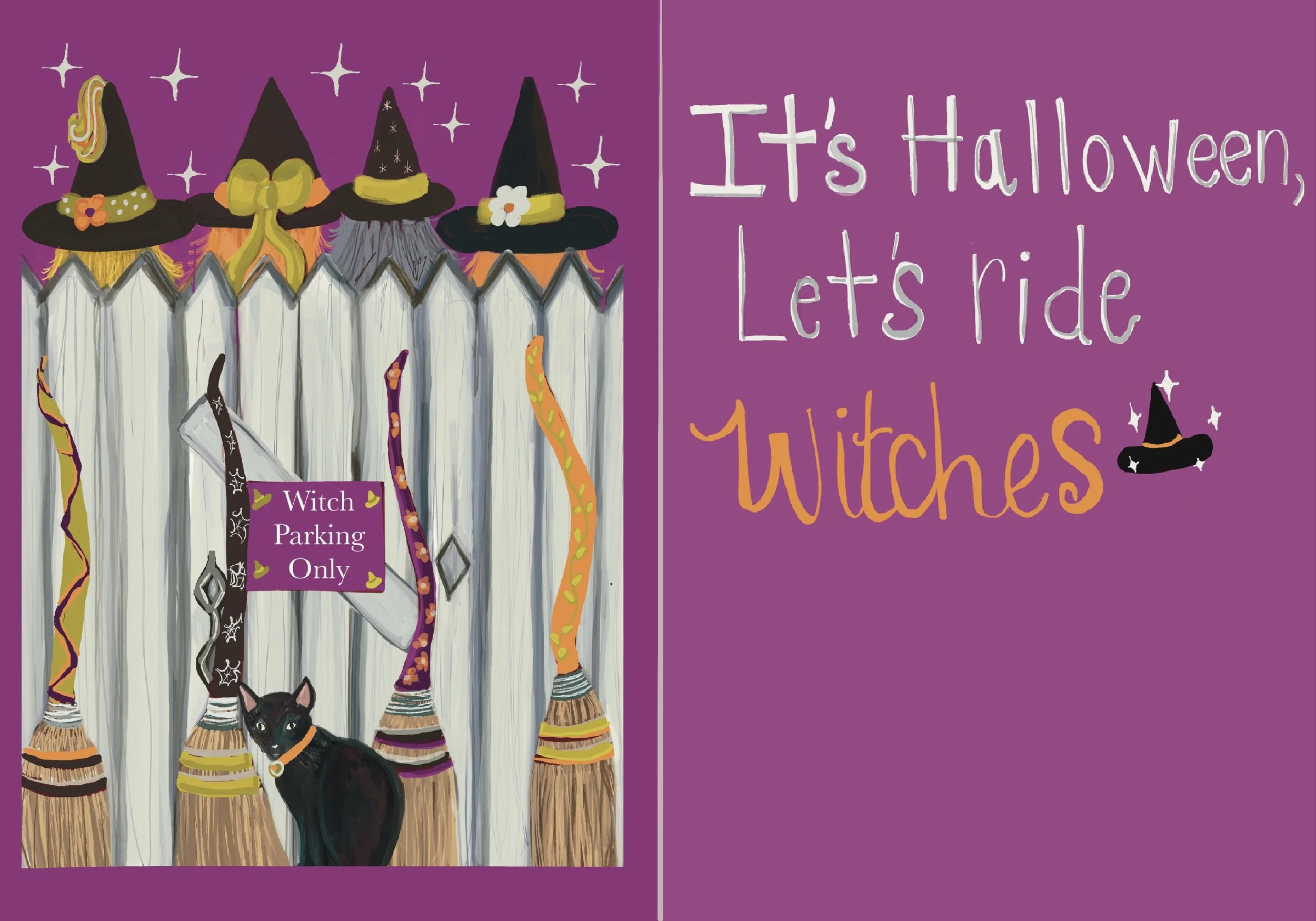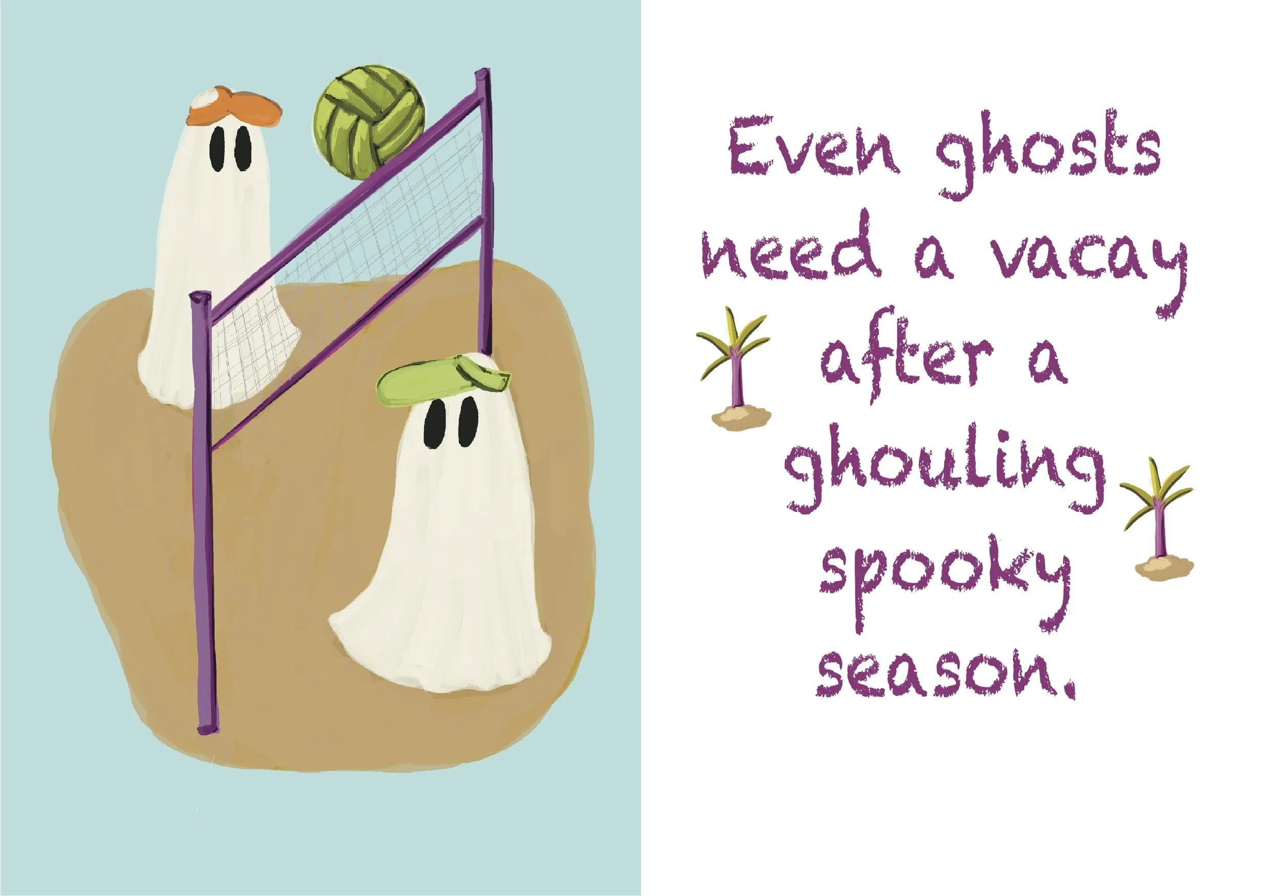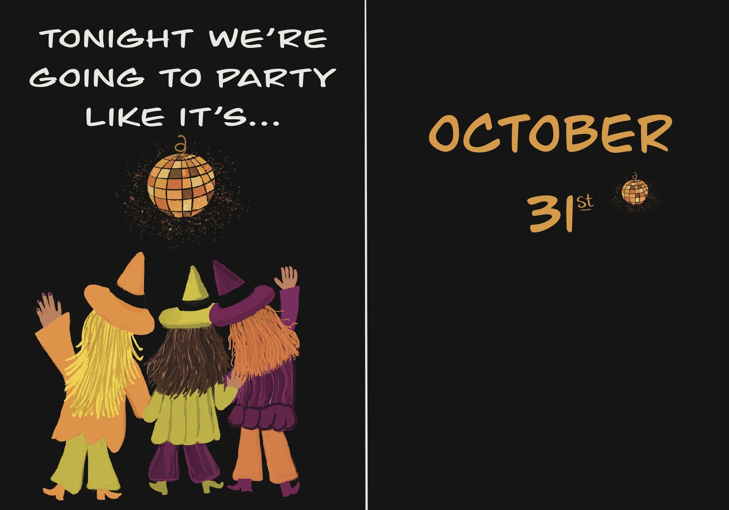 A spooky Halloween-themed display shelf with jars labeled "Spare bones," a collection of spell books, a crystal ball, and a moth. The middle shelf has glow-in-the-dark eye boggle tubes, a witch's hat, a skull with a cobweb, and signs labeled "witch's hat" and "Fred." The bottom shelf features a ghostly companion with a sign, a potion labeled "Pumpkin guts," and a cauldron filled with white balls, with the signs.