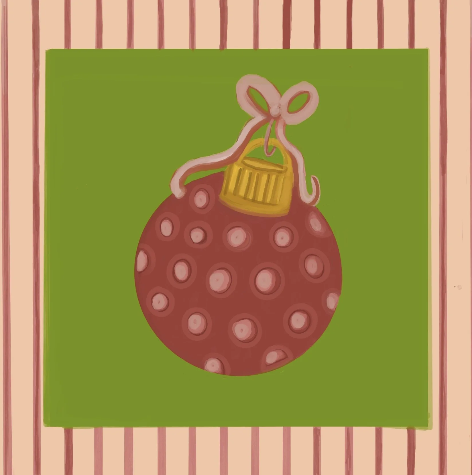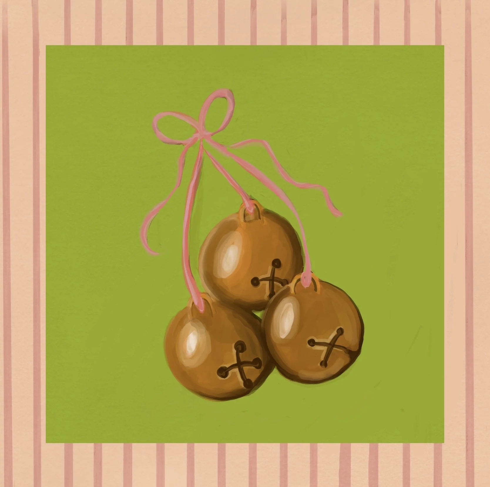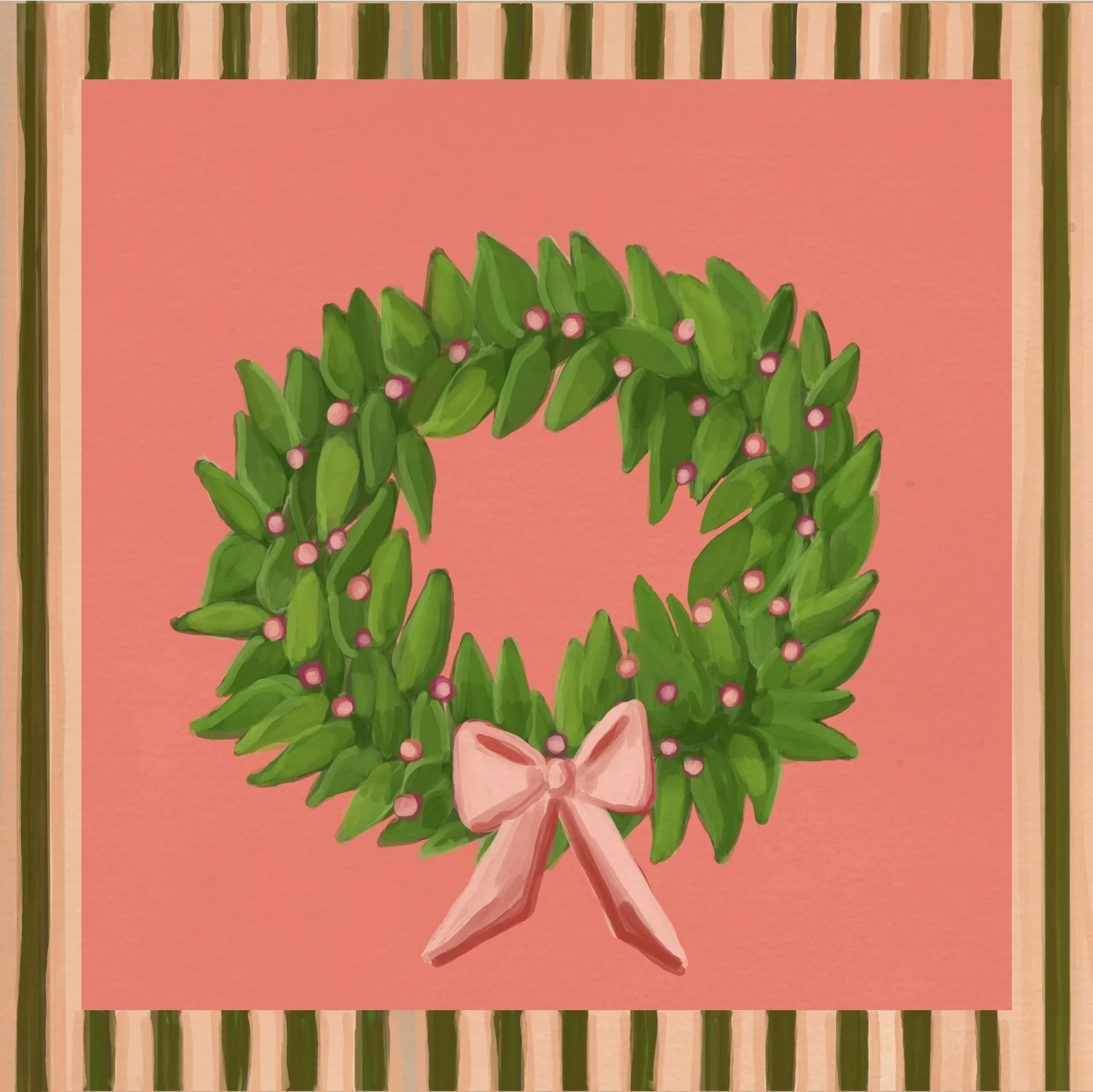 Illustration of two pink hearts connected by green stems, tied with a pink bow and topped with a green heart-shaped loop, set against pink and white horizontal striped background.