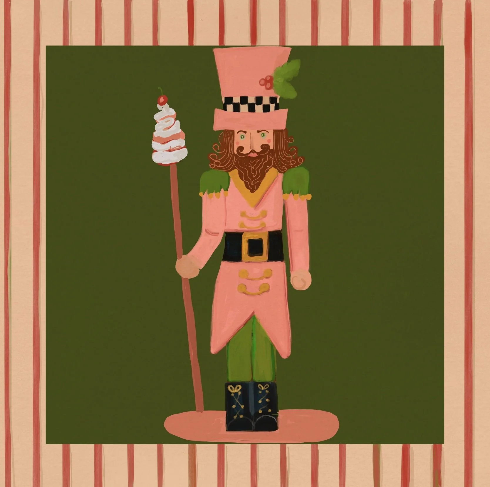 A digital illustration of a pink soft serve ice cream cone with a strawberry on top, set against a green background with white polka dots and small black hearts.